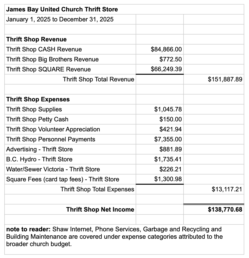 Rarely does anyone who has been around JBUC for any length of time talk about the Thrift Shop as a source of revenue. And for good reason. Regardless of whether you donate goods or are a faithful shopper; or you are one of the Thrift Shops dedicated volunteers, or rely on the friendly words and smiling faces as a point of connection in your day; you can see (even if you just watch from a distance) clearly that the value of the James Bay United Church Thrift Shop is the connection, the people work and the humanity of the enterprise.