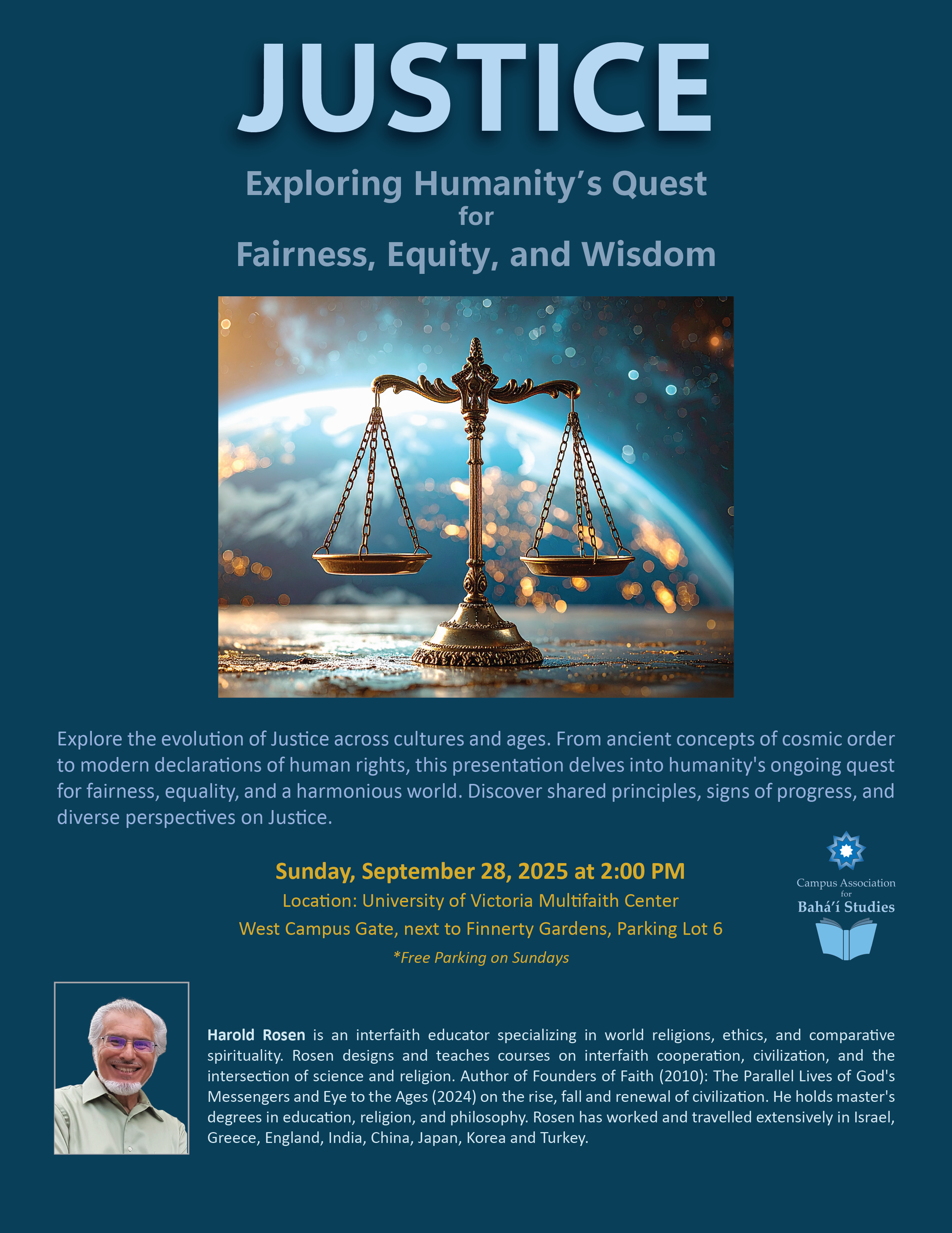 Justice: Exploring Humanity's Quest for Fairness, Equity and WisdomSeptember 28, 2:00 pm, UVic Multifaith Centre Explore the evolution of Justice across cultures and ages. From ancient concepts of cosmic order to modern declarations of human rights, this presentation delves into humanity's ongoing quest for fairness, equality, and a harmonious world. Discover shared principles, signs of progress, and diverse perspectives on Justice.